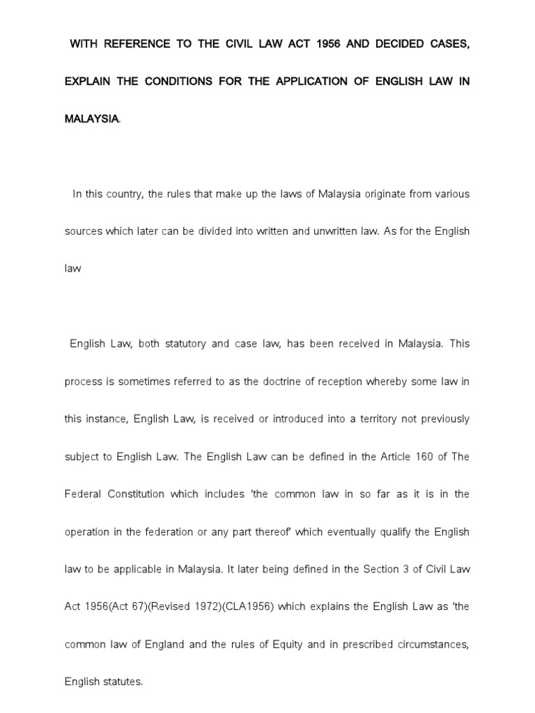 There are many applications you can use for english common law in malaysia. …the law of england was introduced into this settlement(penang) immediately on possession taken in the name of the king of england by and for the use of the late east india despite such expression of doubt, the judge felt bold enough to justify the application of english law in penang. It all depends on what you feel comfortable using. Introduction malaysian legal history has been determined by events spanning a period of some six hundred years. Amira fatin binti mohd azhar 2018674438 nurdarina binti baderoi 2018286692 muhammad rusydi bin.