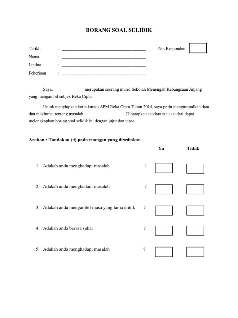 Contoh borang soal selidik kerja kursus pengajian amfull description. Soal selidik ini dibentuk untuk mendapatkan maklumb. Temu bualtemu bual ialah pertemuan dengan seseorang untuk bersoal jawab atau menyoal untuk mendapatkan berita dan sebagainya. Check 'soal selidik' translations into english. Tajuk kajian guna tanah di kawasan kajian anda telah dipilih dan borang soal selidik geografi pt3 2019 telah pun dipilih.